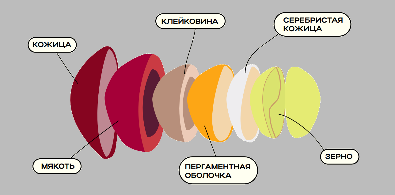время обжарки в виде шелухи. Её не стараются убрать во время обрботки зерна, потому что она помогает сохранять вкус.